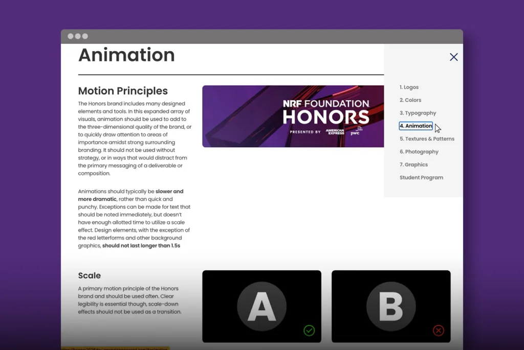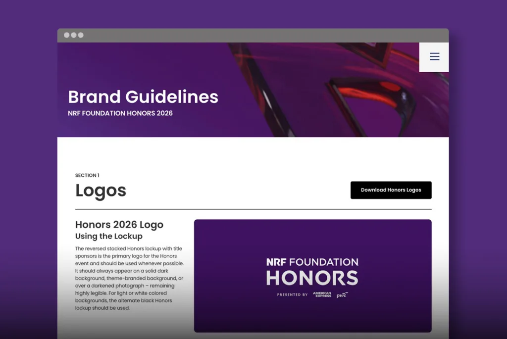 Just in case you need more convincing, let’s examine our client, the National Retail Federation (NRF) Foundation. For years we have worked with them to build the NRF Foundation Honors awards event in NYC. It comes together over 10 months, beginning every year with the reimagination of the brand and then steadily evolving to incorporate input from internal teams and external contractors as more and more deliverables are produced. We used to capture all that creative in a PDF styleguide, but this year we’ve upgraded to a website that can be edited throughout the year.