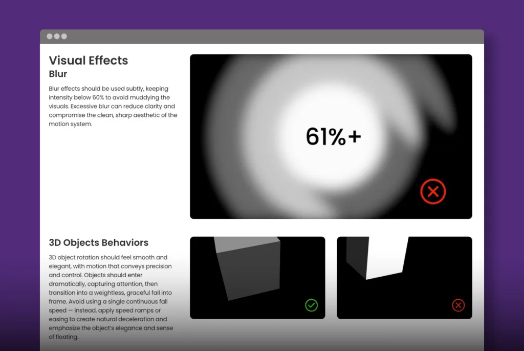 Another advantage of this strategy is the depth of detail that can be accomplished when more tools are available to build with. When it comes to aspects of the show that aren’t easily represented by static images, we found PDFs lacking once again. Take motion effects for example. In a PDF, you can’t add video without either jacking the file size up to astronomical heights, or pointing the viewer to an external link. With a website, it’s incredibly easy to add GIFs and MP4 files to supplement whatever motion concept you want to demonstrate. That’s way better than trying to type out bulleted lists describing a motion sequence! After all, being able to see examples of how all these interconnected pieces work together is half the battle of visualizing the full, cohesive brand.