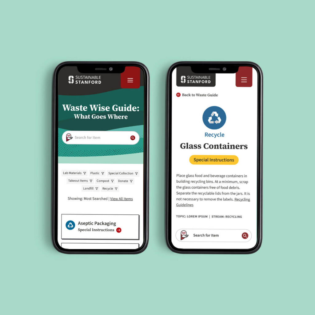 Stanford had two big ideas for the site: a Waste guide to help users correctly dispose of items, and a Data Hub to showcase sustainability progress. Both needed goals, structures, database systems, and functional solutions defined.