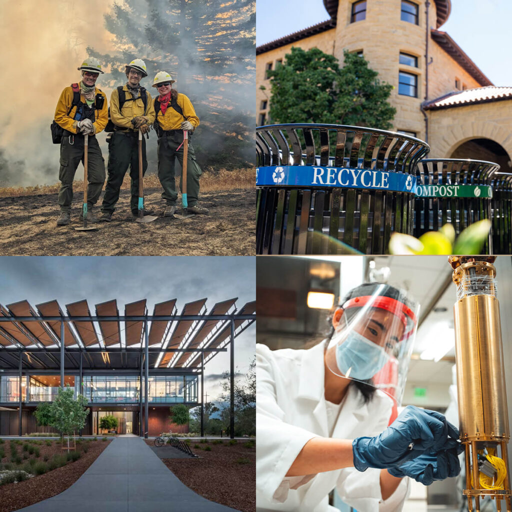 Four photos of Sustainable Stanford, students helping with wild fire, recycle and compost bins on campus,  sustainable building, student in lab