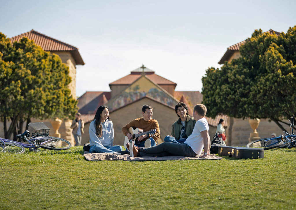 Students sitting/hanging out on hill in front of Stanford Memorial Church