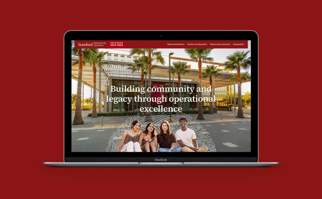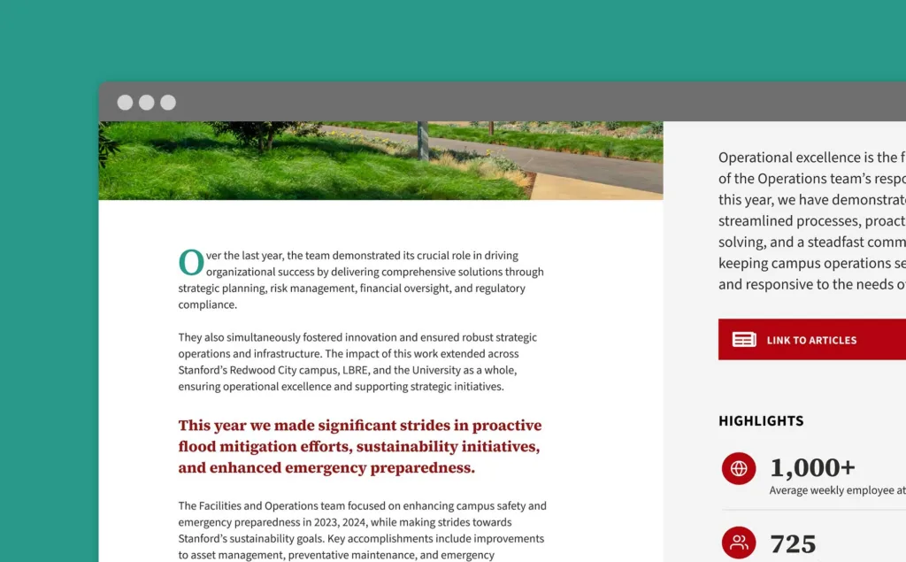 In addition to the main site, we designed and built a year-in-review microsite for Stanford’s Redwood City campus. Created for the Operations department, the site details the work of the team to keep the campus running, foster community, and promote sustainability.