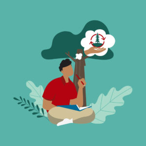 Illustration style: student sitting on ground holding notebook and pencil thinking about sustainability